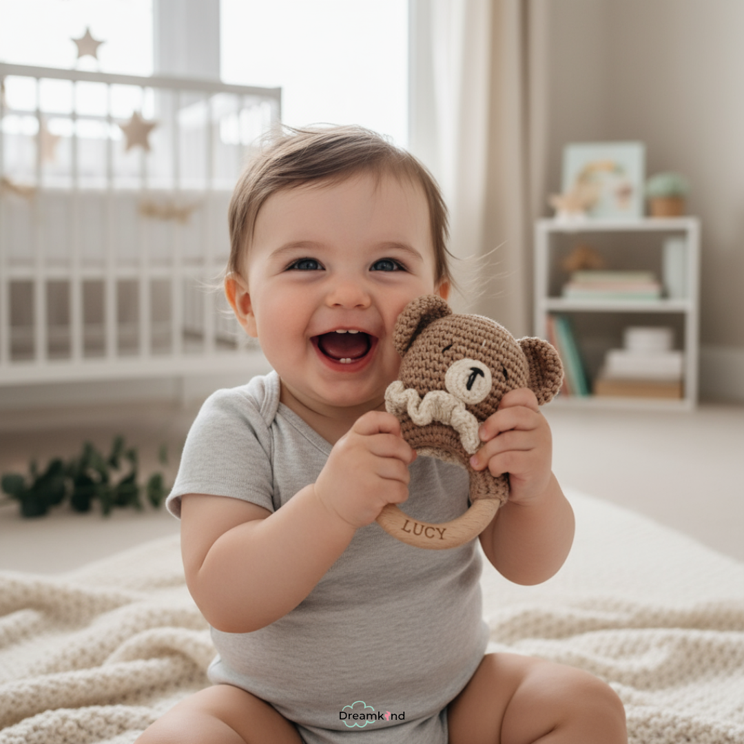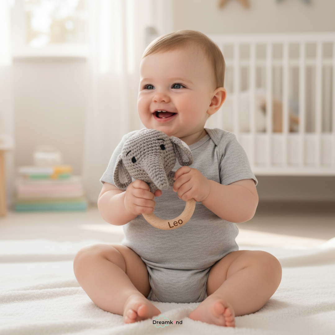 - Einen handgefertigten Greifling – mit Name gravierbar und ideal zum Greifen und Spielen