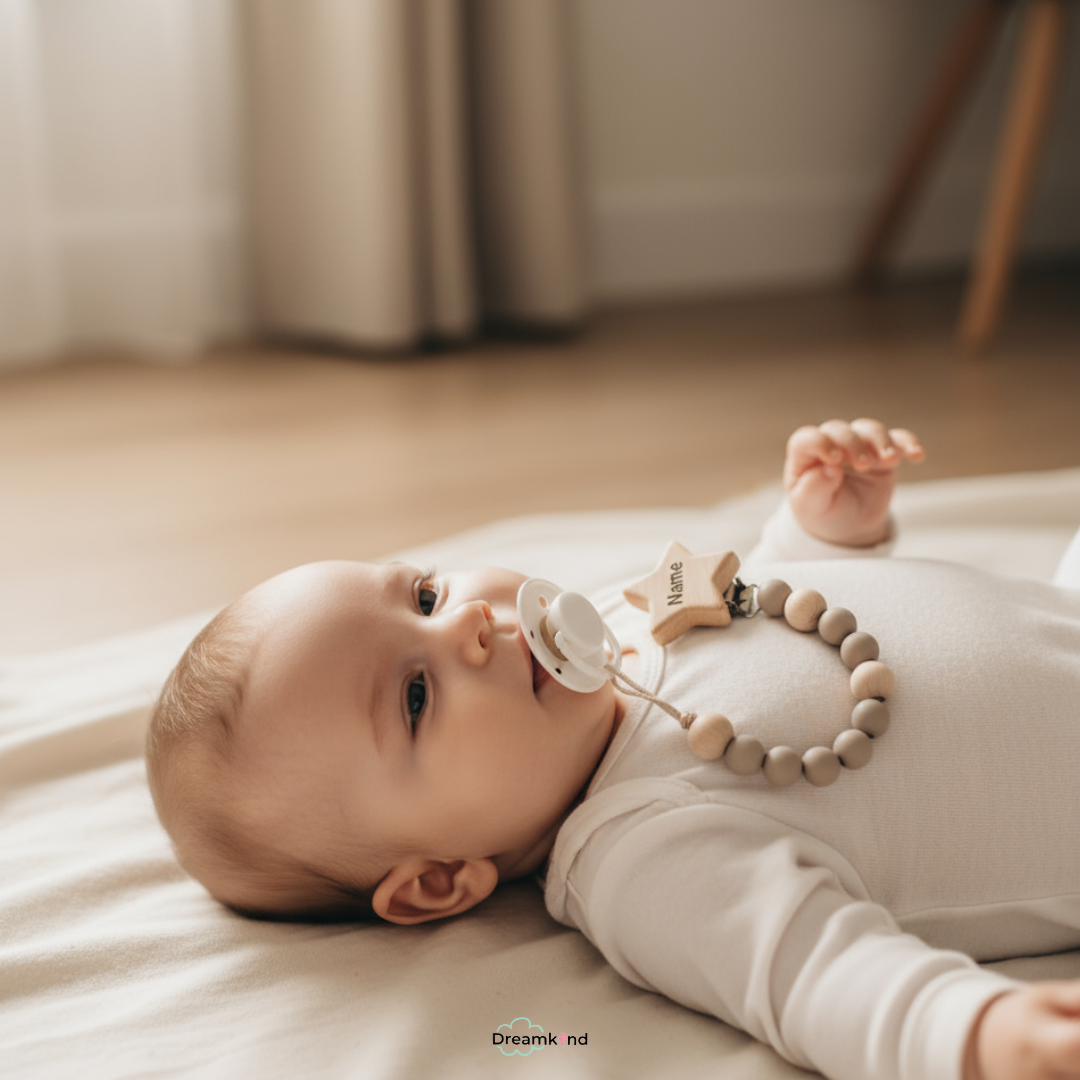 - Eine Schnullerkette mit Holz- und Silikonkugeln – ebenfalls individuell mit Namen gravierbar